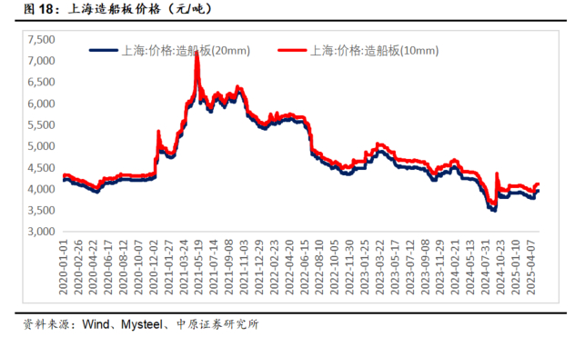 20mm造船板价格2021年见顶后持续调整,2025年5月有小幅反弹到3950元/吨,整体仍处于低位,有利于船舶制造企业盈利修复。