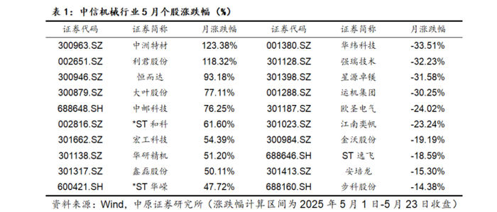 个股方面,截止到2025年5月23日收盘,沪深两市5月中信机械板块632只个股,其中415只上涨,203只下跌,涨跌幅中位数为2.49%。