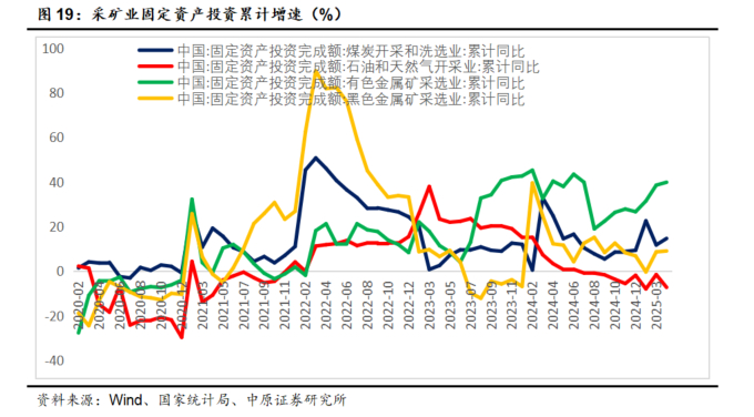 资源开采类:近年来煤炭、有色金属开采行业固定资产投资增速非常高。2025年4月煤炭开采及洗选固定资产投资累计增速14.7%,有色金属开采固定资产投资累计增速39.9%,在2023-2024年连续增长的高基数上延续增长态势。