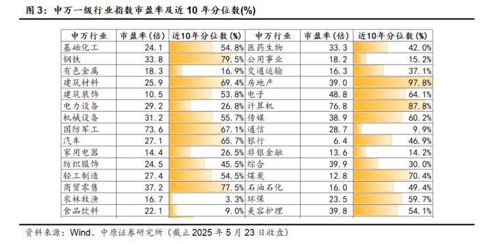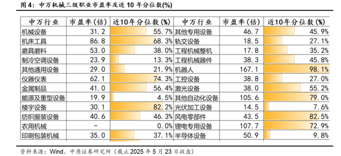 从申万一级行业指数市盈率及近10年分位数来看,截止2025年5月23日收盘,申万机械行业市盈率为31.2倍,位于近10年市盈率分位数的55.7%,处于行业估值均值水平偏上。