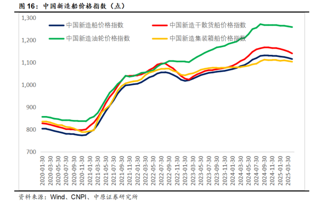 2025年4月底中国新造船价格指数为1115点,环比下降5个点。其中,中国新造干散货船价格指数1140,中国新造油轮价格指数1258,中国新增集装箱船价格指数为1103,环比分别下跌9、3、3个点。