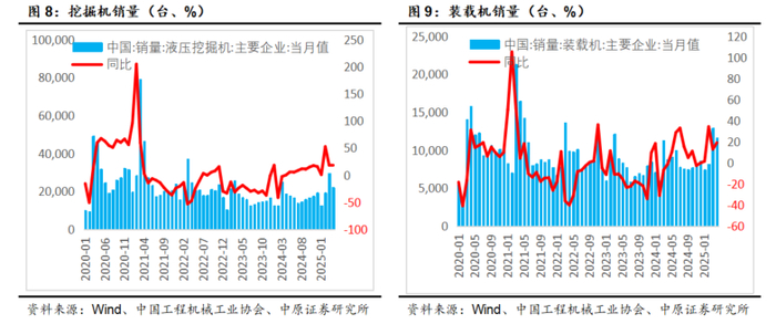【4月装载机销量11653台,同比增长19.2%】。据中国工程机械工业协会对装载机主要制造企业统计,2025年4月销售各类装载机11653台,同比增长19.2%。其中国内销量7191台,同比增长35.4%;出口量4462台,同比下降0.18%。