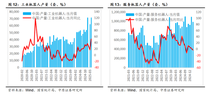【4月工业机器人产量7.15万台,同比增长51.5%】。国家统计局公布数据,2025年4月工业机器人产量达71547台,同比增长51.5%,增速显著高于今年之前月份。2025年1-4月累计产量221206台,同比增长34.1%,远超2024年4月累计增速(9.9%)。4月服务机器人产量为98.3万套,较去年同期下降3.4%。(数据来源:国家统计局)