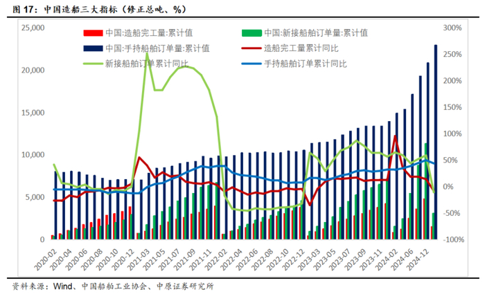 2025年1-4月份,全国造船完工量1532万载重吨,同比下降8.4%;新接订单量3069万载重吨,同比下降11.1%。截至4月底,手持订单量22978万载重吨,同比增长43.6%。2025年1-4月我国造船完工量、新接订单量和手持订单量分别占全球总量的49.9%、67.6%、64.3%。