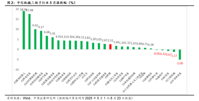 5月中信机械板块上涨2.51%,跑输沪深300指数(2.96%)0.44个百分点,在30个中信一级行业中排名第18名:截止到2025年5月23日收盘,5月中信机械板块上涨2.51%,跑输沪深300指数(2.96%)0.44个百分点,在30个中信一级行业中排名第18名。5月三级子行业服务机器人、核电设备、纺织服装设备、其他运输设备、仪器设备涨幅靠前,分别上涨18.96%、17.48%、9.92%、9.17%、6.68%;半导体设备、工程机械、3C设备跌幅靠前。