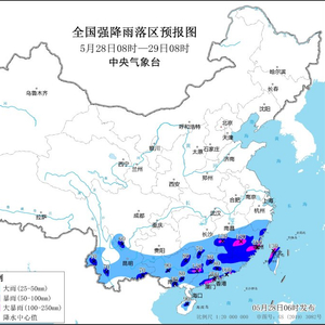 图1 全国强降雨落区预报图(5月28日08时-29日08时)