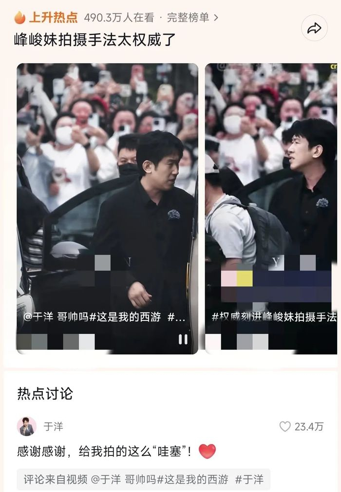 于洋在《这是我的西游》游戏淘汰后,被时团粉丝拍到“人生镜头”,在抖音上#峰峻妹拍摄手法太权威了#话题度飙升,甚至“蹲”到于洋本人亲自回复。