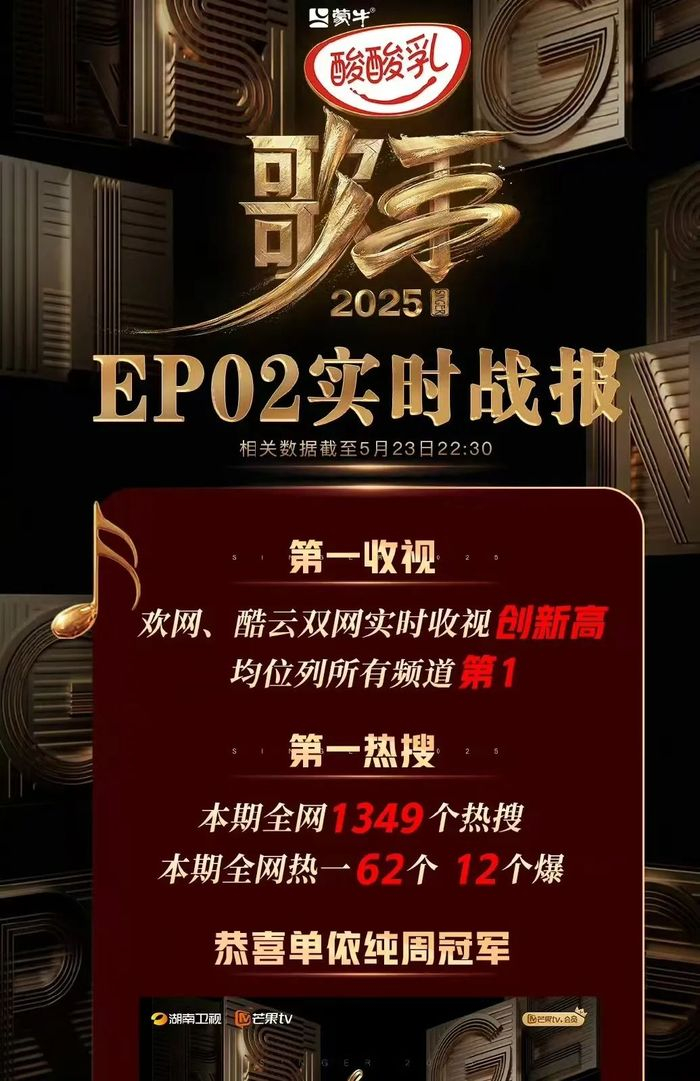 但无论双方怎么吵,不得不说马嘉祺的确是《歌手2025》的流量密码,根据CVB数据显示,第二期收视比首期提升9%,CVB 收视率干到 0.62,市场份额 2.67%,收视率峰值创新高,峰值冲破0.8776,排名省级卫视第1。