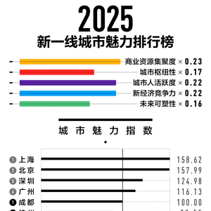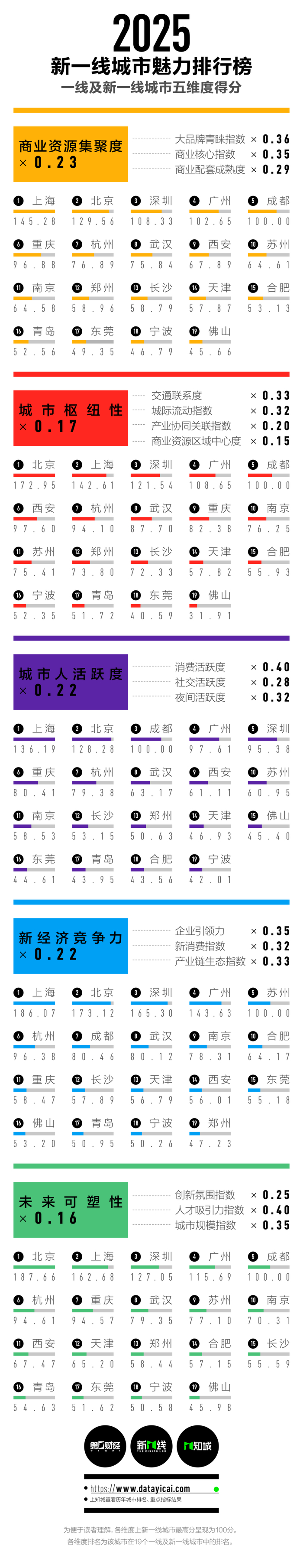 《2025新一线城市魅力排行榜》的指标体系包含了商业资源集聚度、城市枢纽性、城市人活跃度、新经济竞争力和未来可塑性五大一级维度。榜单的一级与二级维度权重以新一线城市研究所专家委员会打分的方式计入,二级维度以下指标数据则采用主成分分析法。榜单各细分维度指标主要采用2024年全年或者截至2025年年初的数据计算得出。