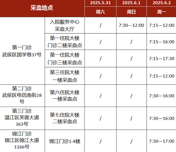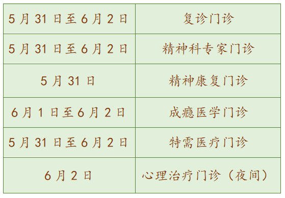 1. 院本部(青羊院区)、龙泉院区、皮肤病性病研究所(四道街院区)、四川省精神医学中心(温江院区)门诊5月31日至6月2日(周六至周一)正常开诊。
