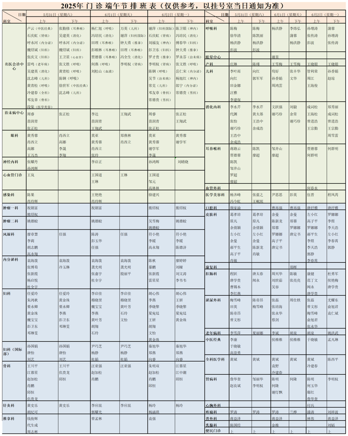 2025年端午假期四川省人民医院多院区门诊安排如下: