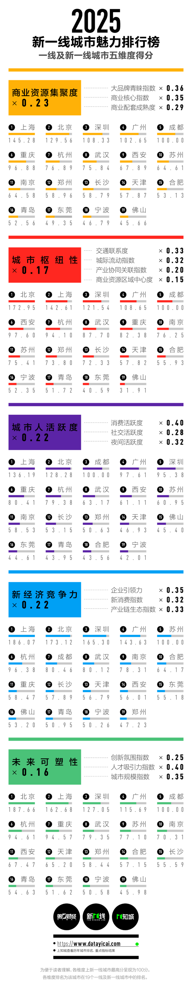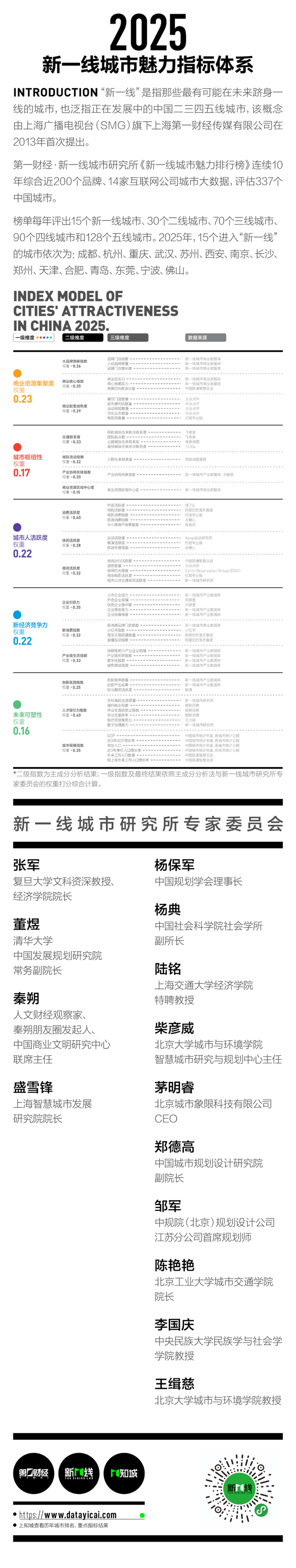 《新一线城市魅力排行榜》的指标体系包含了商业资源集聚度、城市枢纽性、城市人活跃度、新经济竞争力和未来可塑性五大一级维度。榜单的一级与二级维度权重以新一线城市研究所专家委员会打分的方式计入,二级维度以下指标数据则采用主成分分析法。榜单各细分维度指标主要采用2024年全年或者截至2025年年初的数据计算得出。