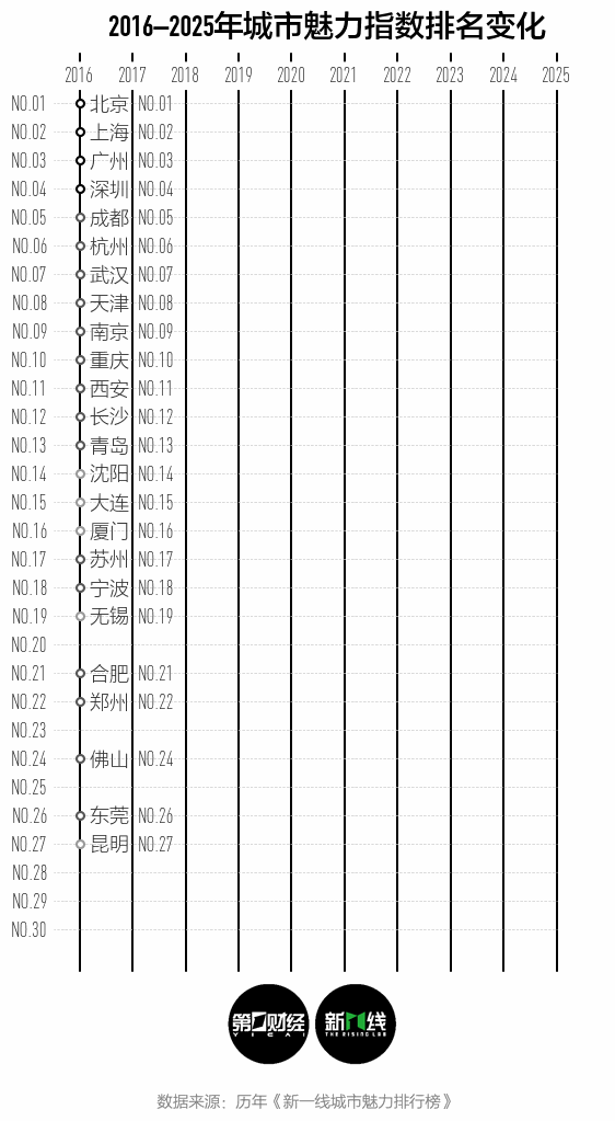 这份记录了2016年至2025年各城市魅力排名变化的折线图,反映了当下中国不同梯队城市的竞争格局。