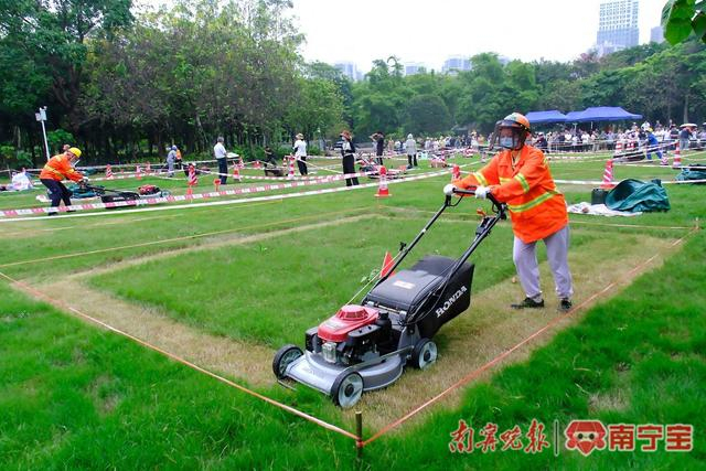 当天,在南宁市花卉公园,各参赛人员穿戴统一的安全防护服装,在个人对应的草坪上展开大比武。随着剪草机的轰鸣声,不一会儿,杂草丛生的草坪就被修剪得边界线清晰、美观,完成修剪后各参赛人员又快速将剪除的杂草清理干净,他们出色的表现得到观赛群众一致好评。