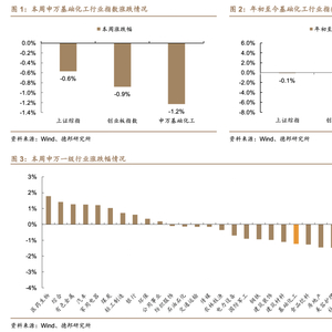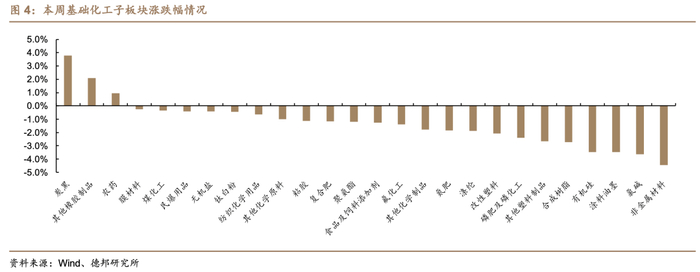 细分板块看,在基础化工26个子板块中,3个子板块上涨,23个子板块下跌。本周子版块领涨前三名分别为:炭黑(+3.8%)、其他橡胶制品(+2.1%)、农药(+0.9%);本周子版块领跌前五名分别为:非金属材料(-4.4%)、氯碱(-3.7%)、涂料油墨(-3.5%)、有机硅(-3.5%)、合成树脂(-2.7%)。