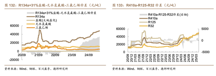 四氯乙烯:本周四氯乙烯价格4630元/吨,环比-6.1%。供应端:本周四氯乙烯市场供应小幅回落,场内企业存在降负与提负并存的情况,整体开工仍维持高位。需求端:本周国内制冷剂R125市场运行平稳,企业资源以自用为主。受益于夏季高温带动的混配需求上升,以及行业生产配额制度的限制,双重利好共同推动价格稳中有升。目前企业多以单质混配为主,按需组织生产,个别装置有停车检修计划。