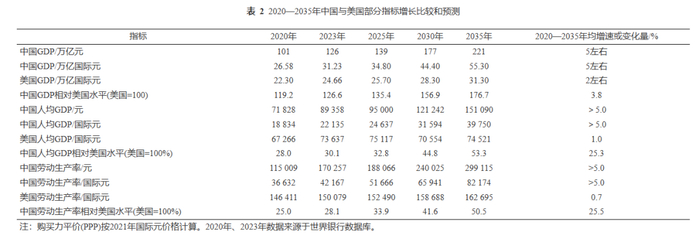按人民币不变价格计算,到2020年中国人均GDP相当于2000年的4.72倍,年均增速8.1%[6]28;按2021年国际元计算,中国人均GDP从2000年的3 989国际元上升至2020年的18 834国际元,年均增速为8.1%,相对于美国人均GDP水平从7.2%上升至28.0%,提高了20.8个百分点,平均每年1.04个百分点⑤;中国劳动生产率从2000年的7 113国际元上升至2020年的36 632国际元,年均增速为8.5%,略高于人均GDP增速,相对于美国劳动生产率水平从6.4%上升至25.0%,提高了18.6个百分点,平均每年提高0.9个百分点。进入21世纪的头20年,中国经济追赶美国突出体现在三个方面:经济总量(GDP)、经济个量(人均GDP)、劳动生产率(劳均GDP)。其中,最重要的也是最根本的是劳动生产率的追赶,从而促进了经济个量、经济总量的追赶。本文预期未来时期中国仍然会实现这三类指标的经济赶超,成为到2035年基本实现社会主义现代化的经济实力基础(详见表 1)。