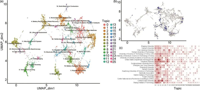 基于近两个月发表的锂电池文献,采用BERTopic主题模型对其摘要文本进行分析,构建锂电池论文的研究主题图,展示该领域研究的全局态势,如图1(a)所示。每个点代表一篇论文,点之间的距离反映了论文在主题上的相似度,而不同颜色则代表不同的研究主题。近期研究成果主要集中在26个主要主题,形成了明显的集群,聚合物电解质、高镍正极、锂硫电池、硅负极、枝晶生长、石墨电极等关键材料和组件的研究主题集中在图的右半部分,电池性能预测、热安全等电池管理相关主题主要分布在左半部分。选择其中100篇加以评论,在主题图中以蓝色点标记,如图1(b)所示,广泛覆盖了高镍正极、锂硫电池、固态电解质、电解质溶液、硅基负极、枝晶生长等多个关键主题。图1(c)进一步展示了主要研究机构的近期研究动向。