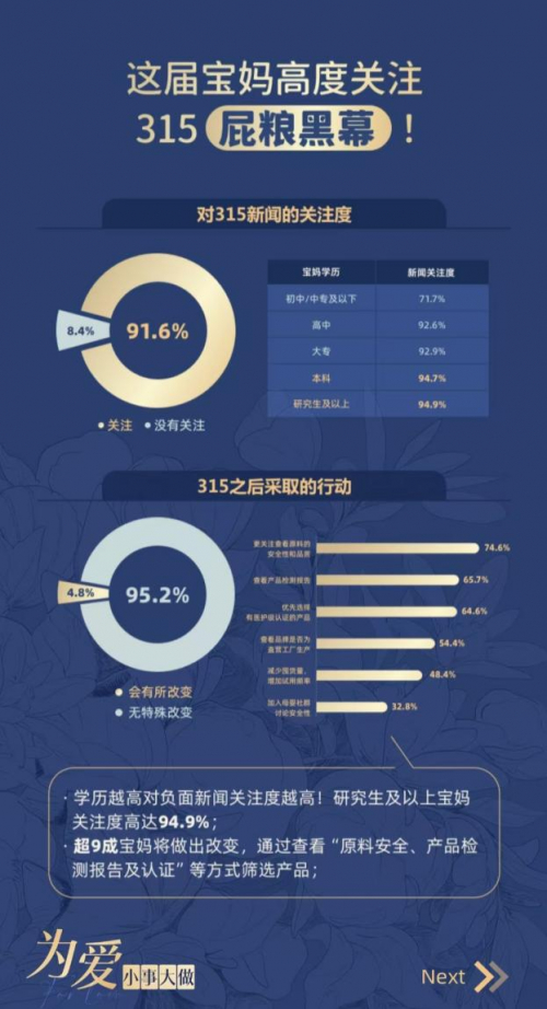 今年,“纸尿裤残次翻新”事件无疑对母婴市场产生了深远影响。宝宝树研究数据显示,学历越高者对此事件关注度越强,研究生及以上学历宝妈关注率达94.9%。事件发生后,超过95%的宝妈在购买纸尿裤时变得更加谨慎,查看产品检测报告已成为常规操作。此外,直营工厂品牌的偏好度大幅提升,反映出消费者对品牌信任体系重构的迫切需求。