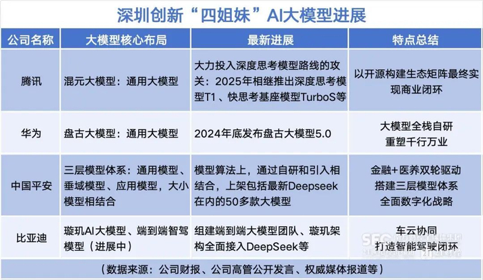 从通用大模型到垂直模型,深圳创新“四姐妹”各有侧重:华为盘古大模型、腾讯混元大模型位居国内通用大模型前列,她们的模型能力不仅服务于自身业务,还在持续对外输出、赋能千行百业;中国平安、比亚迪更强调模型体系与自身业务场景的深度融合。
