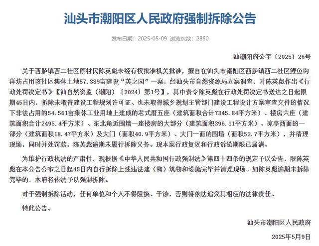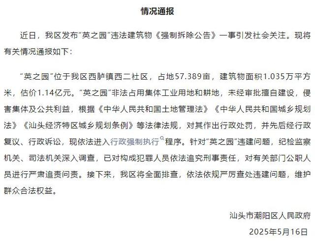 5月9日,潮阳区政府曾发布公告称,西胪镇西二社区原村民陈英彪未经有权批准机关批准,擅自在西二社区鲤鱼沟洋坊占用该社区集体土地57.389亩建设“英之园”,经汕头市自然资源局立案调查,对陈英彪作出《行政处罚决定书》,其中责令陈英彪在行政处罚决定书送达之日起限期45日内将相关建筑拆除,并清理现场,同时并处罚款,陈英彪逾期未履行拆除义务。