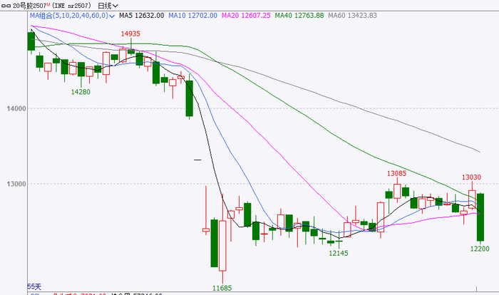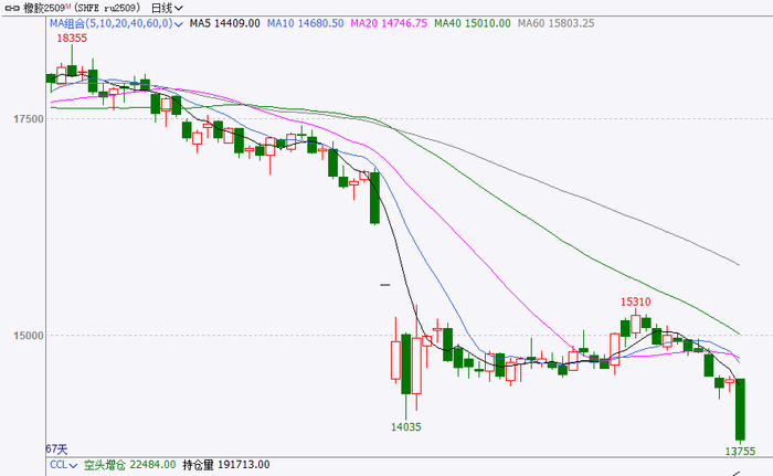 20号胶今日开盘一路下行,收盘12245元/吨,跌幅4.52%,跌回4月初水平。沪胶走势与20号胶一致,今日一路震荡下行,主力合约日盘收盘报13805元/吨,收跌4.36%。