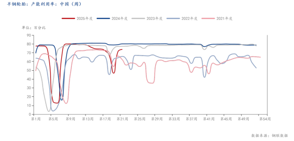 (2)钢联数据显示,上周期半钢胎样本企业产能利用率为73.74%,环比增2.53个百分点,同比降6.35个百分点,库存周转天数周环比增加1.22天至47天;全钢胎样本企业产能利用率为62.09%,环比增2.21个百分点,同比降4.11个百分点,库存周转天数环比增加0.09天至42.86天。轮胎企业开工率同比降幅较大,且库存周转天数环比增加,需求偏弱。端午节即将到来,部分企业有检修计划,预计本周轮胎企业开工率有小幅走低可能。