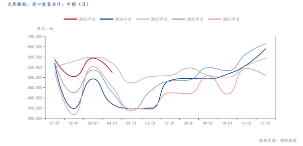 (4)据美国气象局天气预报显示,国内外主产区未来两周降雨量减弱,对割胶工作影响减小。今年以来国内外主产区整体天气状况较好,且原料价格同比处于较高水平,国内产区即将进入旺产期,今年橡胶供应维持上量预期不变。4月天胶进口量52.32万吨,同比增41.64%;1-4月累计进口220.89万吨,累计同比增24.25%,供应偏宽松。