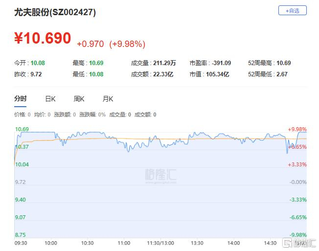 尤夫股份:连续2天涨停,换手率21.46%,成交量211.29万手,成交额22.33亿元。龙虎榜数据显示,机构合计净买入3683.63万元。北京中关村等知名游资榜上有名。