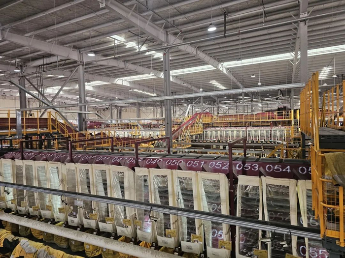 第2层为小件区,采用韵达自主研发的新型三层超高速交叉带,每层拥有100余个供件口平台,最高速度高于行业平均水平约20%,每小时可处理超过20万票包裹,并实时监测快递包裹的位置和运行状态,通过科技创新和数字化改造,提高转运效率和质量。