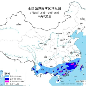 今晨(28日),中央气象台继续发布暴雨黄色预警:预计今天,江南中南部、西南地区南部、华南大部、台湾岛大部等地部分地区有大到暴雨,其中,江西中部、福建西部和东南部、广西东部、广东西部和南部沿海地区、台湾岛中北部等地部分地区有大暴雨(100~200毫米)。上述部分地区伴有短时强降水(最大小时降雨量30~50毫米,局地可超过60毫米),局地有雷暴大风等强对流天气。