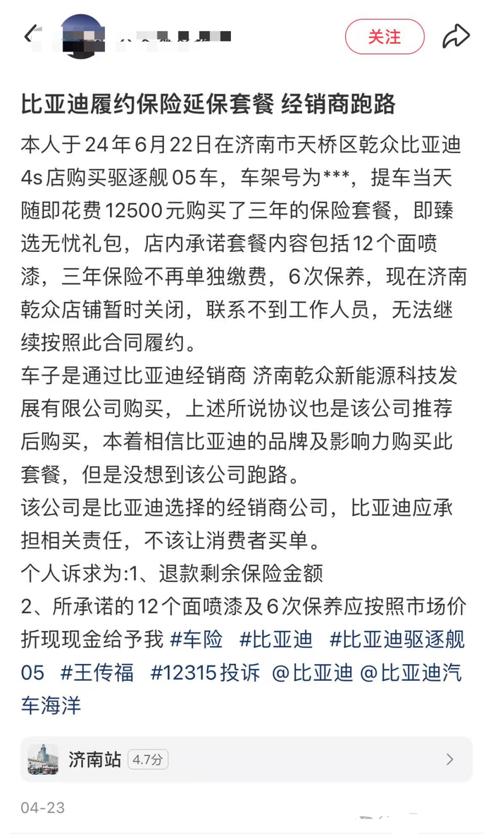 据市场消息,济南乾城汽车贸易有限公司于4月17日发布《关于处理三保服务事宜的解决方案》,提到“近两年由于比亚迪经销商政策调整,对我司的现金流管理带来巨大压力。加之山东地区多个汽车经销商行业暴雷,当地银行融资政策保守,造成我司融资更加困难等系列问题,导致我司运营资金面临巨大挑战”。