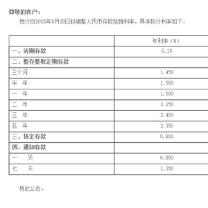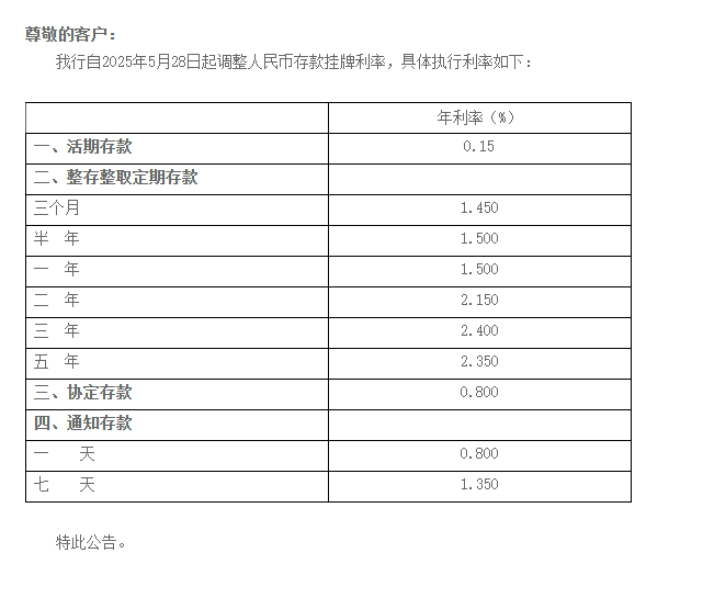 根据上海瑞华银行发布的公告,自5月28日起,该行执行新的人民币存款挂牌利率,三年期、五年期整存整取定期存款利率分别调整为2.40%、2.35%,一年期、二年期存款利率保持不变。