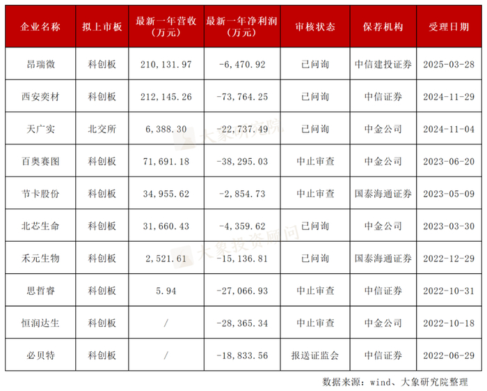 截至目前,提交上市申请并处于在审排队阶段的仅剩10家未盈利企业,这10家企业中,有1家处于提交注册仍未获批的阶段,4家处于中止审查状态,其余处于已问询/已回复状态。具体情况如下:
