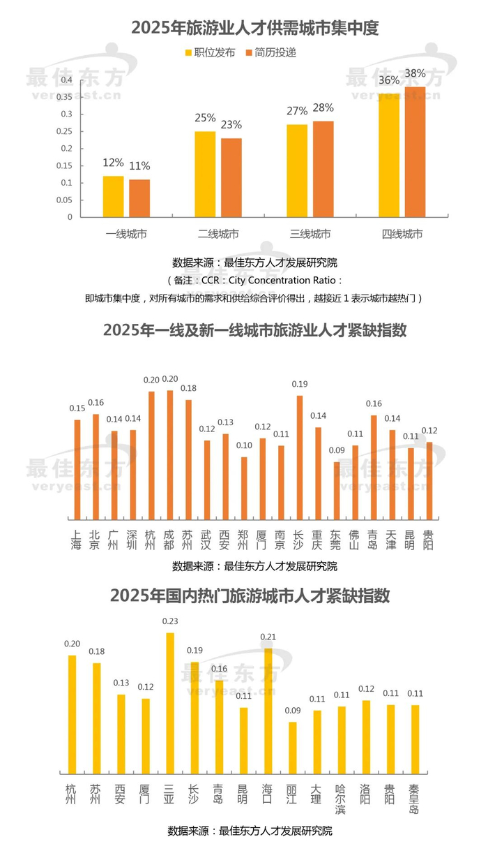 最佳东方数据显示:旅游业就业地区分布上,一二线城市、旅游热门城市新增就业岗位占全国总量的33%,人才密度高于全国均值2.3倍,流动率也同比上升;一线及新一线城市高端人才过剩与三四线城市基层人才短缺的供需矛盾凸显,需要政策和产业的联动调剂机制。其中,海南(国际旅游消费中心)、云南(非遗文旅)、陕西(历史IP开发)、新疆(长线旅游)、浙江(民宿经济)、四川(文旅项目集群)的岗位呈现出明显的地域特色需求特征:海南自贸港高端管理岗位(如宴会统筹、康养管家)需求激增,要求多语种沟通能力及国际会展经验;云南地方非遗传承人、民俗活动执行导演等岗位需求旺盛,强调文化IP转化能力;新疆低空飞行体验官、包车调度员需求上升,要求掌握交通法规及个性化出行方案设计能力。