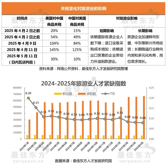 关税从18世纪保护本土产业到21世纪演变为战略威慑工具,其引发的旅游业震荡既体现为国际客源萎缩、供应链成本攀升等显性冲击,更深层次推动行业向国内市场、技术赋能、区域协同方向进,长期倒逼行业转向内需和多元化布局。第一,旅游业(酒店、景区、餐饮等)提供大量无需高技能门槛的基础服务岗位,如客房清洁、餐饮服务、导游等,吸纳因关税导致制造业成本上升而失业的劳动力;第二,人力资源和社会保障部发布的《2025年第二季度人力资源市场供需分析报告》预测,6月全国人才市场求职人数环比将增加35%,企业招聘需求环比增长预计仅为12%,供需比为1:1.6,就业形势依然严峻。最佳东方数据显示,2025年求职数仍在大幅跃升,也佐证了这一点,叠加关税等外部因素,倒逼劳动力从单一制造技能向服务、技术复合能力转型。
