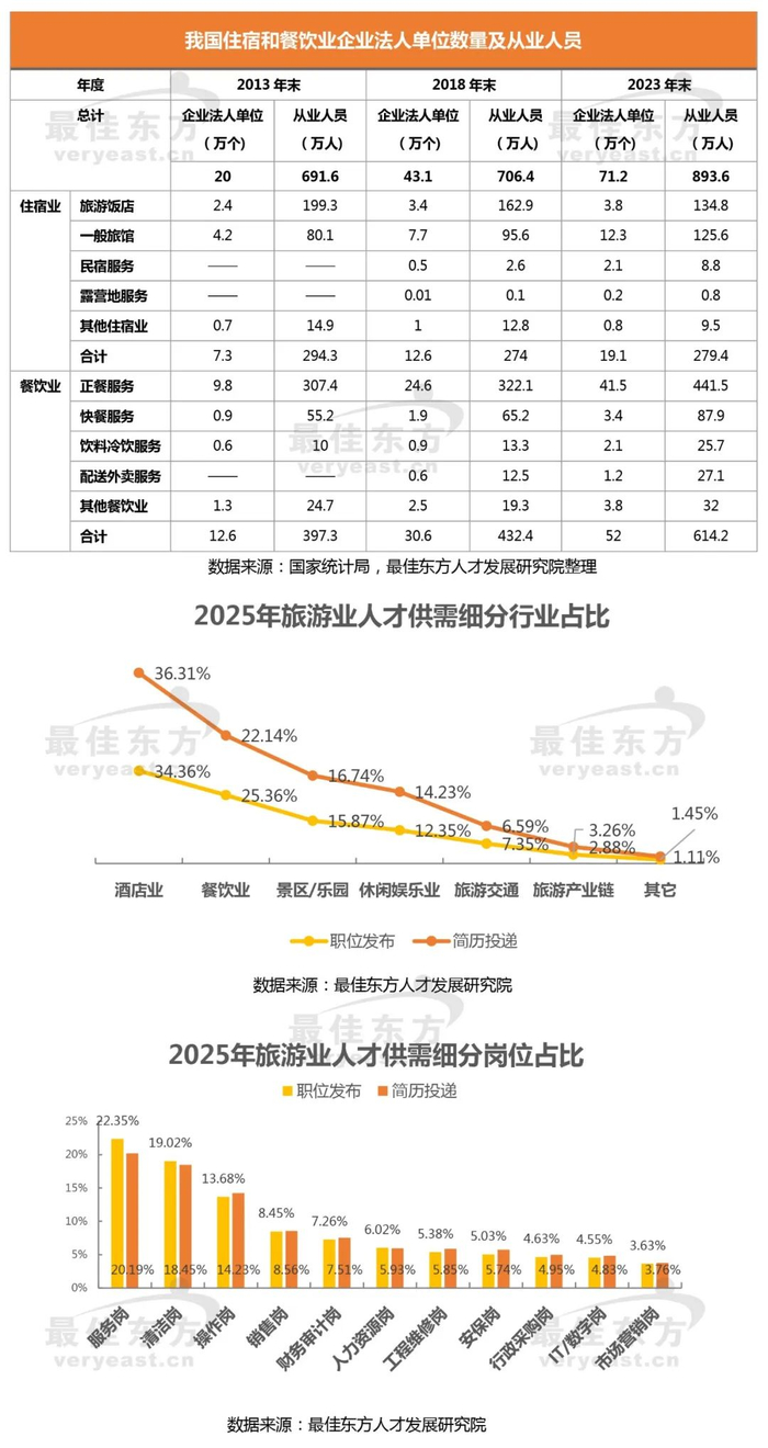 第一,就业机会:旅游业作为劳动密集型产业,就业范围涵盖导游、酒店服务、景区管理等多个领域,间接带动相关产业发展,如餐饮、住宿、交通、零售等,间接创造了更多就业机会。第二,就业弹性:旅游业具有较强的就业弹性,能够根据市场需求的变化灵活调整就业规模。在旅游旺季时,可以增加临时性、季节性工作岗位,吸纳更多劳动力就业。第三,就业包容:旅游业对劳动力的年龄、性别、教育程度等要求相对较低,特别是对于少数民族地区居民、妇女、农民工等特定人群,在解决其就业方面发挥着重要作用。从我国第三次、第四次、第五次经济普查结果显示,旅游就业人数同比增长分别为2.1%和26.5%,近年来增速明显加快。最佳东方数据显示:旅游人才供需细分行业中,酒店餐饮业吸纳就业能力较强;细分岗位除了一线操作服务岗位外,其它占比逐渐均衡。