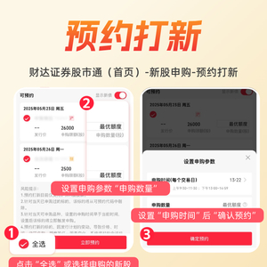 财达证券股市通「预约打新」功能颠覆传统 ——提前设定你的专属申购条件,全天候智能监控市场动态,触发条件瞬间自动完成申购!无需熬夜盯盘,不必担心手速慢,打新成功率直线飙升