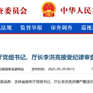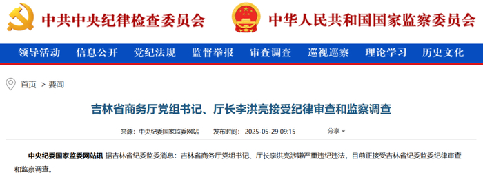 5月29日,据中央纪委国家监委网站消息:吉林省商务厅党组书记、厅长李洪亮涉嫌严重违纪违法,目前正接受吉林省纪委监委纪律审查和监察调查。