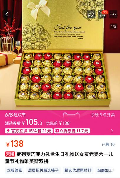 问题在于,这些“拼装”版巧克力礼盒,虽大部分内容物为低价巧克力,但并没有制定一个明显异于认知的低价,这也是令消费者放松警惕的一个原因。例如,一款“520德芙巧克力高档礼盒”,双层包装,上层为24颗唯美斯巧克力,下层为18颗德芙巧克力,优惠价也要121元。商品名中未体现“唯美斯”字样,结合图片与价位,极易让人误以为是费列罗和德芙的拼搭,而实际上该礼盒的内容物成本不会超过60元。
