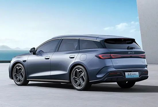 旅行版车型的尾部线条颇为优雅舒展,B/C/D柱均采用熏黑处理,搭配新增的顶部扰流板,营造出悬浮车顶的效果,运动氛围十分浓郁。尾灯组依然采用贯穿式设计,延续了比亚迪海洋网车型的传统。