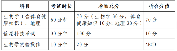各科目分值:语文、数学、外语各100分,其中外语含听力10分;道德与法治50分、历史50分;物理70分(纸笔考试60分,另加实验操作10分)、化学50分(纸笔考试40分,另加实验操作10分);地理30分、生物学30分(卷面总分40分,其中含体育与健康知识10分)。
