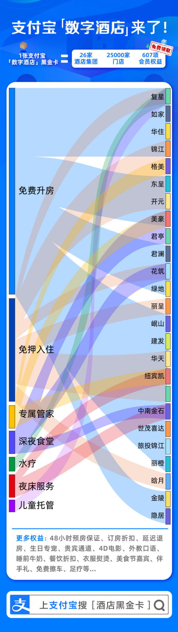 根据合作内容,支付宝用户可免费领取各大集团的会员卡,全国有超过25000家门店参与。据支付宝方面介绍,升级为“数字酒店”后,用户可以通过支付宝无接触入住、免押订房、自助开票、调用酒店周边出行、餐饮等服务。