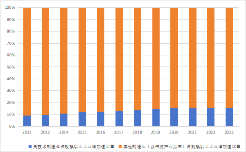 图1:高技术工业和传统工业占规模以上工业增加值的比重