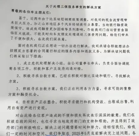 济南乾城发布的《关于处理三保服务事宜的解决方案》显示,济南乾城遭遇资金困境的原因,包括比亚迪近两年频繁调整经销商政策,致使其现金流管理压力剧增。