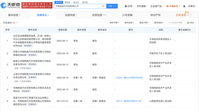司法案件信息显示,济南乾城汽车贸易有限公司涉及多个融资租赁合同纠纷、买卖合同纠纷等案件。变更记录显示,济南乾城汽车贸易有限公司曾在2023年4月、2021年5月、2015年2月发生负责人变更。
