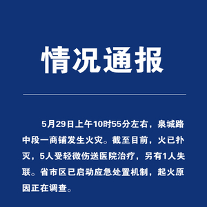 央视网消息:据济南市历下区融媒体中心官方微博消息,济南市历下区应急管理局发布情况通报:5月29日上午10时55分左右,泉城路中段一商铺发生火灾。截至目前,火已扑灭,5人受轻微伤送医院治疗,另有1人失联。省市区已启动应急处置机制,起火原因正在调查。