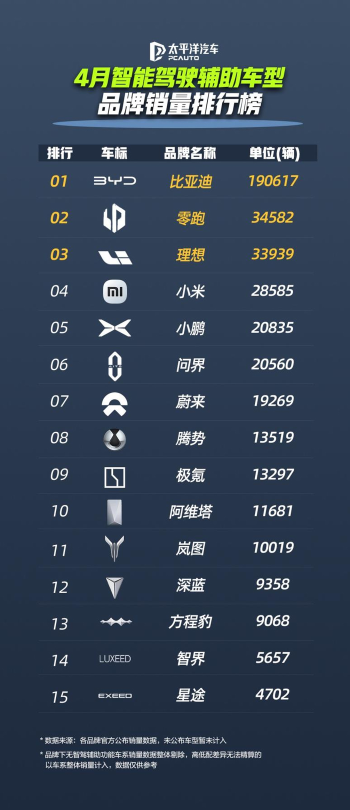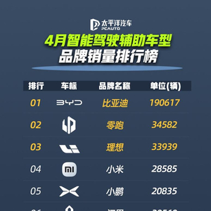 此外,基于乘联会及第三方数据交叉验证的 “智能驾驶辅助车型4月品牌销量排行榜” 显示,比亚迪单月智驾车型销量超过鸿蒙智行、理想、小鹏销量总和的两倍,断层领先。