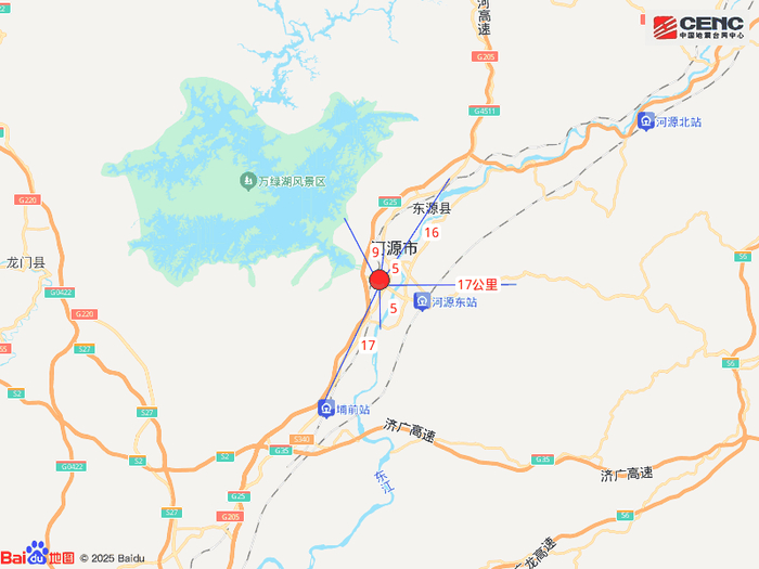 周边县城:震中距源城区3公里、距东源县11公里、距龙门县44公里、距紫金县51公里、距新丰县63公里,距河源市4公里,距广州市159公里。