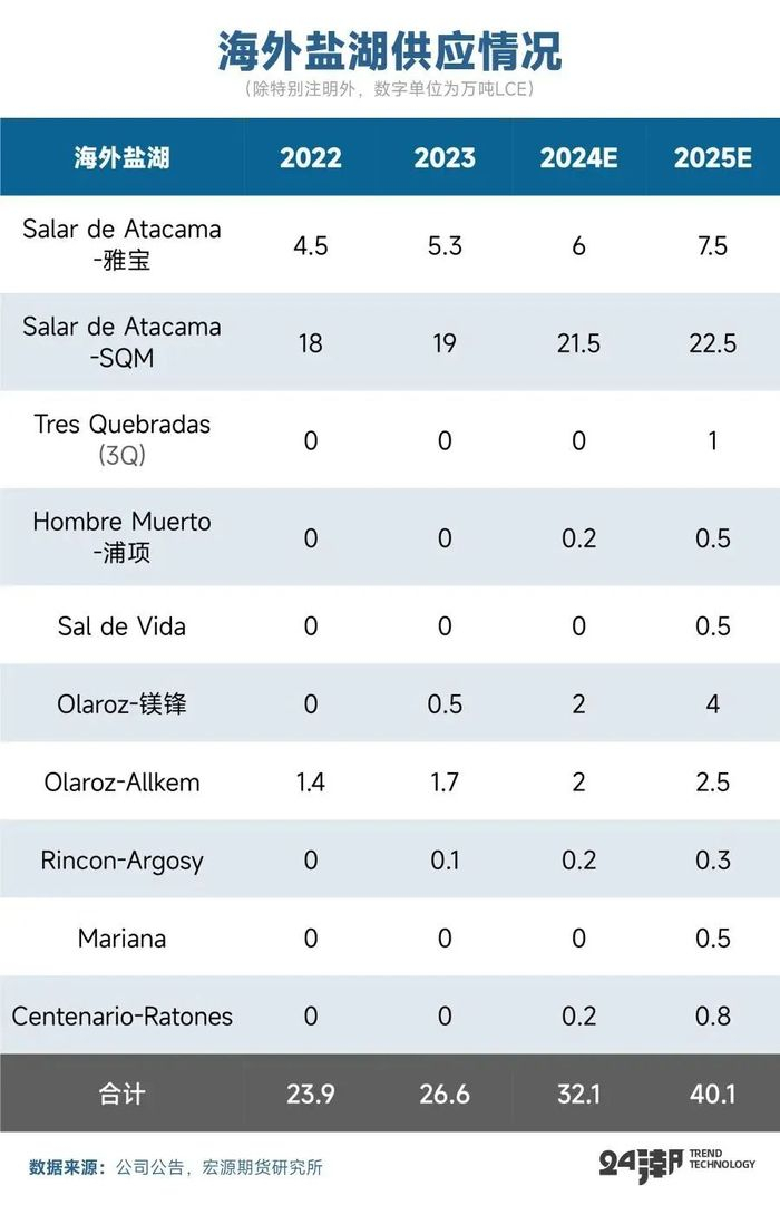 海外方面,南美目前对碳酸锂产量贡献最大的仍是ALB和SQM在智利的Atacama盐湖项目,明年由于不少项目逐渐爬坡以及释放产能,整体盐湖产量将进一步快速释放。今年一季度SQM已经完成了Atacama项目1万吨扩建工程,产能持续提升;ALB-Atacama近两年扩产4万吨,2025年预计将继续爬坡。尽管紫金旗下3Q项目进展不及预期,目前或延期至2025年中投产,但POSCO的Sal de Oro已于10月顺利投产,Centenario也于12月正式投产。此外Olaroz、Hombre Muerto等项目的爬坡也会进一步增加25年产能的释放。根据宏源期货的数据,2025年以南美盐湖为主的海外盐湖供应将达到40万吨(折LCE),同比增长约25%。
